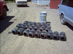 | July 1, 2005. A dozen new 32 gallon garbage cans, 55 gallon pickle barrels, empty potassium chlorate drums, five gallon olive barrels, and seven gallon plastic buckets. We used nearly every contaier we could find. |