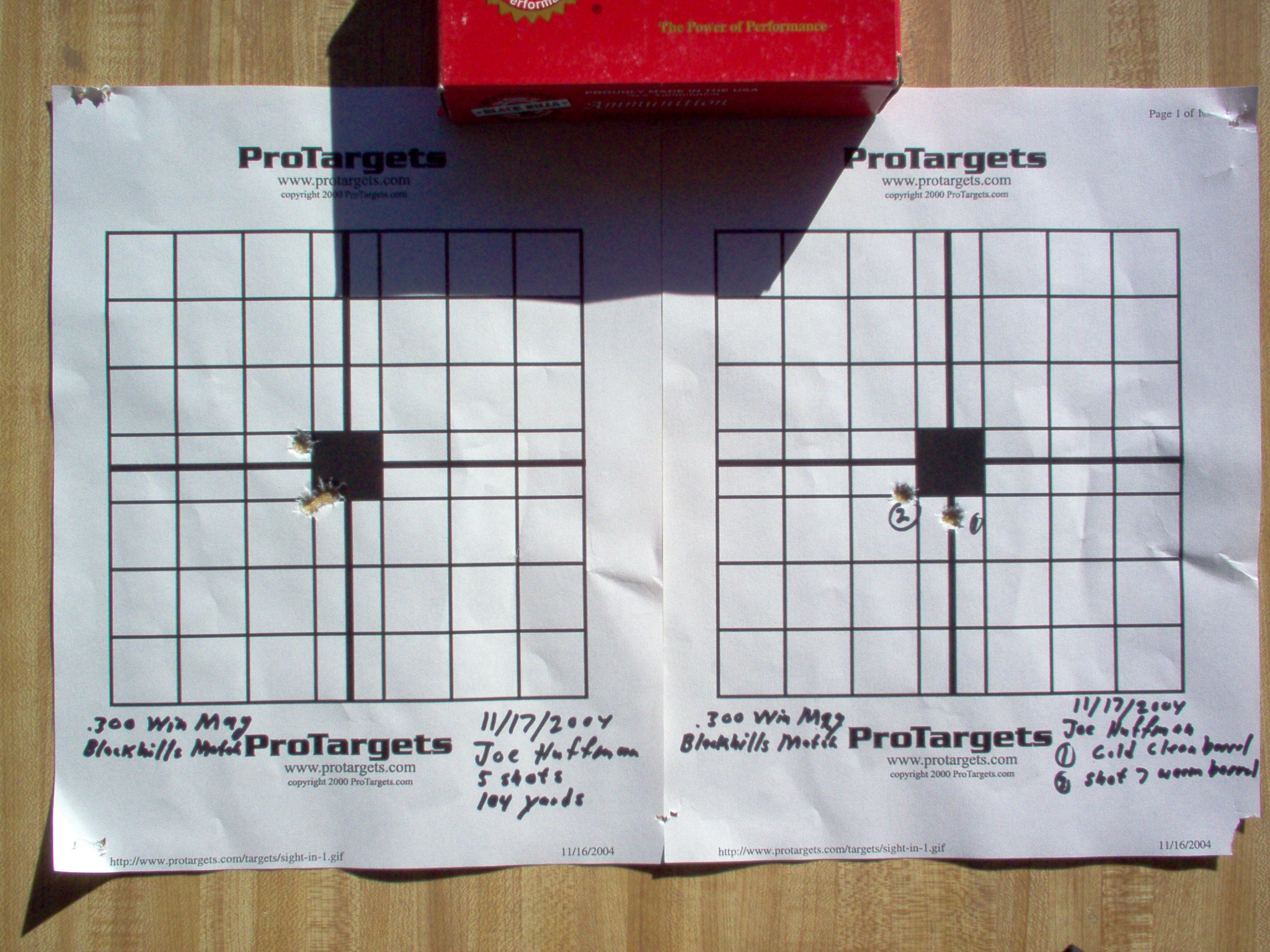 One shot from a clean cold barrel on one target. Five shots on a second target. Another shot on the first target from the warm barrel.