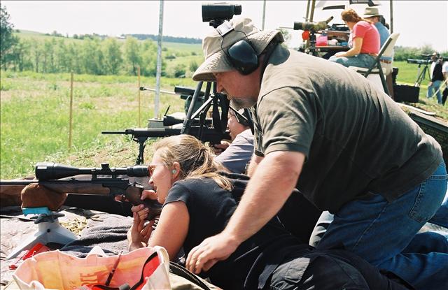 Kim du Toit (on the right) preparing to "help" Stephanie shooting his rifle.