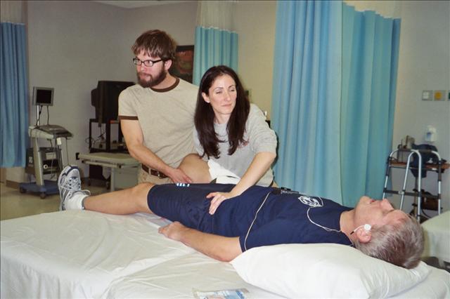 It is a "two person job" to exercise Jason's right hip. Notice the electrodes on Jason's face by his ears.