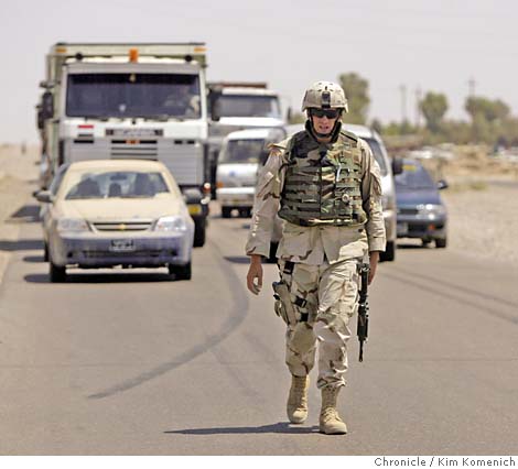 Lt. Jason Scott walks back to his car after a traffic stop on Samarra's Southern Bypass Road. Chronicle photo by Kim Komenich