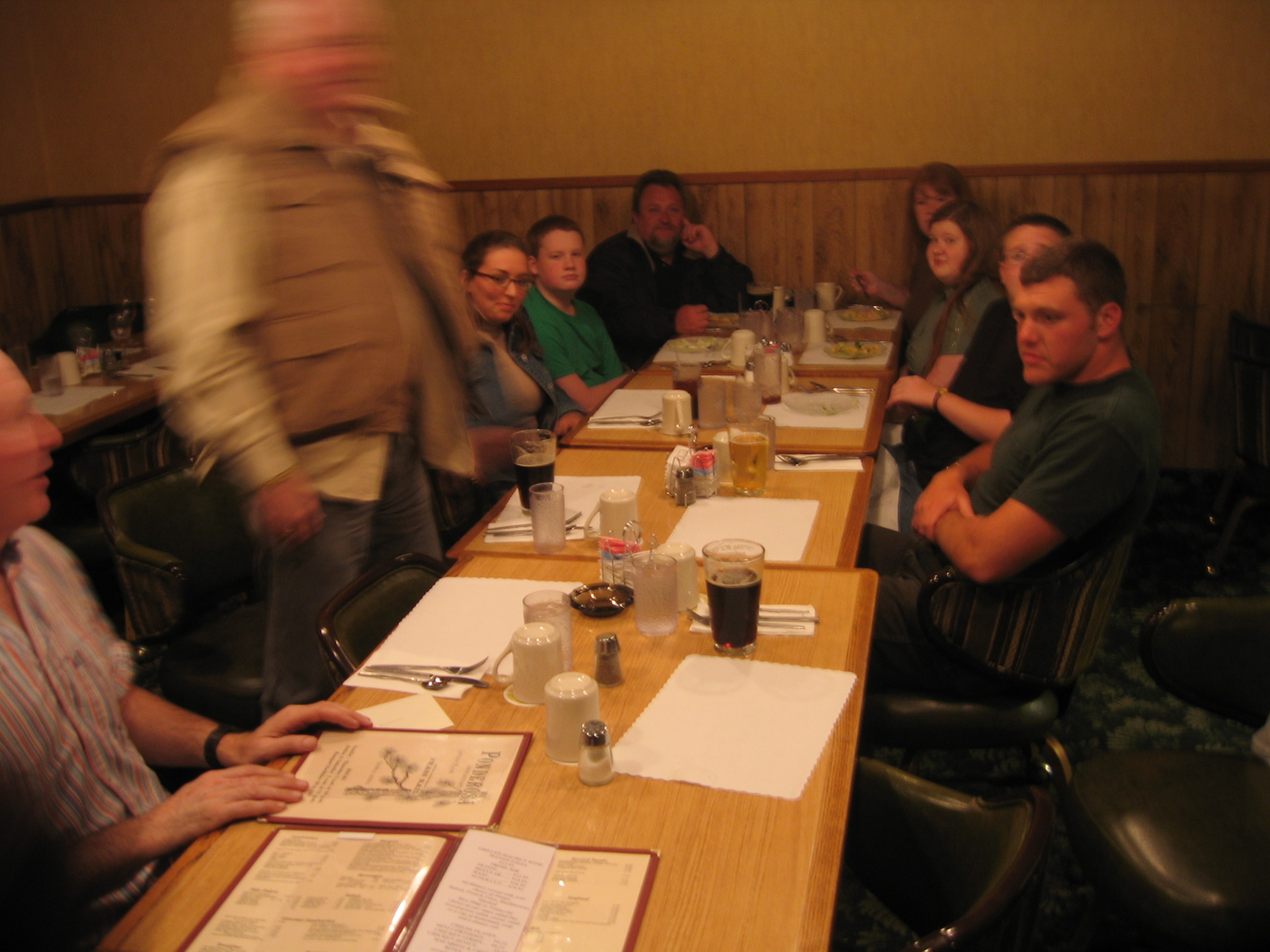 | This is a terrible picture of Bob but one of the best we have of most of the rest of the group. Left to right, Joe Huffman, Bob Coval, Stephanie Sailor, Kim DuToit, Connie's Son, Connie DuToit, Connie's Daughter, Son&Heir DuToit, and Adam Plumondore. |