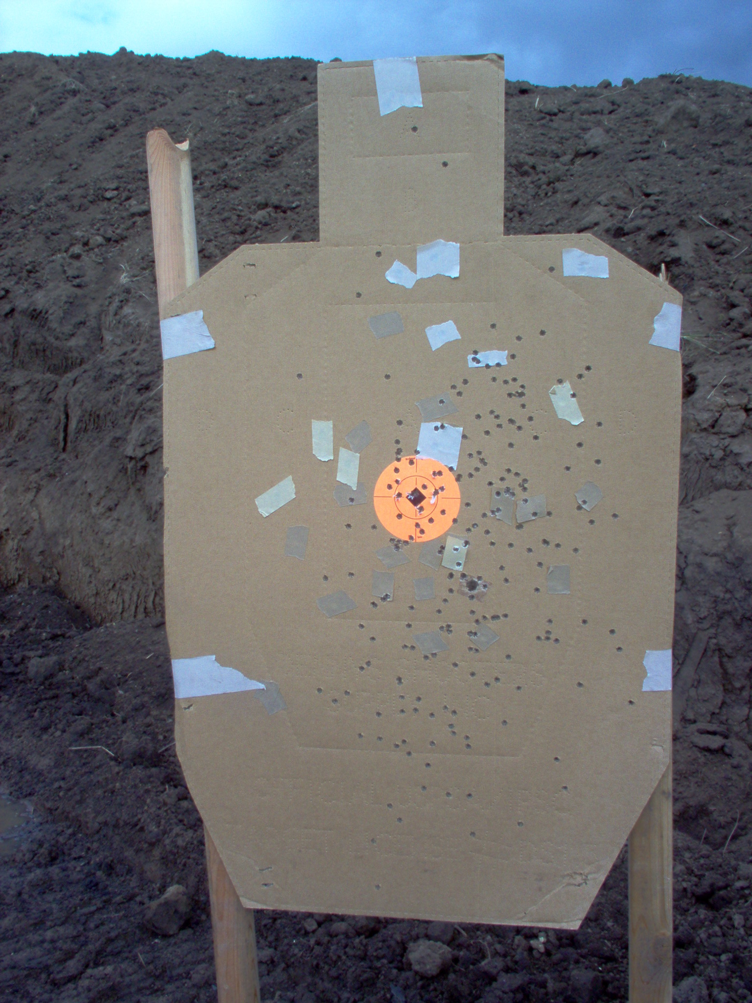 | The second target stand blew down again shortly after I returned to the firing line. With only 110 rounds left I put most of them into this target. I put five carefully aimed shots into the "head" but the wolf ammo in a very hot and dirty gun didn't do well. I then put the last 100 or so rounds with an aim point of just above the orange dot. All these shots took on the on the order of one second each. |