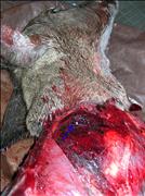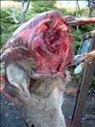 | Exit wound. The spine was severed. The laser range finder gave the range as 255 yards. I shot it at 16:45, October 31th, 2005 on my parents property near Cavendish Idaho. |