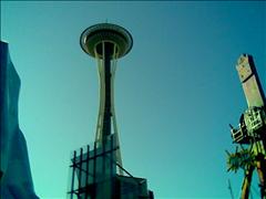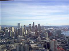 | In the distance is the ferry seen in the previous picture. In the foreground is the Seattle Post Intelligencer building with the globe on the roof. Taken from the restaurant on the Space Needle. |