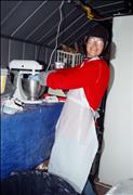 | We started out by making the explosives and putting them in the cardboard target bodies. Here Lisa uses a kitchen blender and mixer with "magic" ingredients to create the high explosives. |