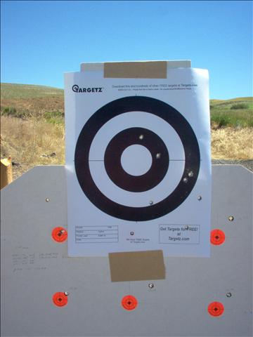 | Pathetic. 10 shots from 50 yards, "rapid fire", open sights, centerfire rifle, offhand. I have hit 18" targets 7 times out of 10 at 200 yards offhand before. This is terrible performance. With starting conditions of an unloaded gun on the table in front of me to when I fired the 10th shot I took 55 seconds. I need to practice more. |