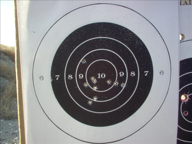 First magazine on the first target from about eight feet away. Better than I expected but the first two were overlapping in the 10-ring so I knew she just got sloppy with the rest. I asked her to try to keep all of them in the 10-ring.