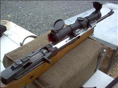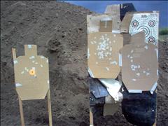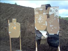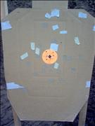 | The second target stand blew down again shortly after I returned to the firing line. With only 110 rounds left I put most of them into this target. I put five carefully aimed shots into the "head" but the wolf ammo in a very hot and dirty gun didn't do well. I then put the last 100 or so rounds with an aim point of just above the orange dot. All these shots took on the on the order of one second each. |