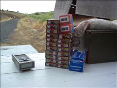 | Not all of the boxes are full. I estimate there were 450 rounds total comsumed in the testing. I used my shot timer (on the left) to time some of the shooting. I averaged about one second between shots and seven seconds for a magazine change. I had three five round magazines with me. I would empty them in under 30 seconds. I would reload the magazines in just over a minute and immediately start shooting again. |