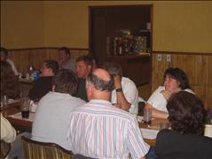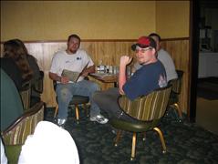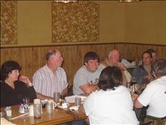 | This is a terrible picture of Bob but one of the best we have of most of the rest of the group. Left to right, Joe Huffman, Bob Coval, Stephanie Sailor, Kim DuToit, Connie's Son, Connie DuToit, Connie's Daughter, Son&Heir DuToit, and Adam Plumondore. |