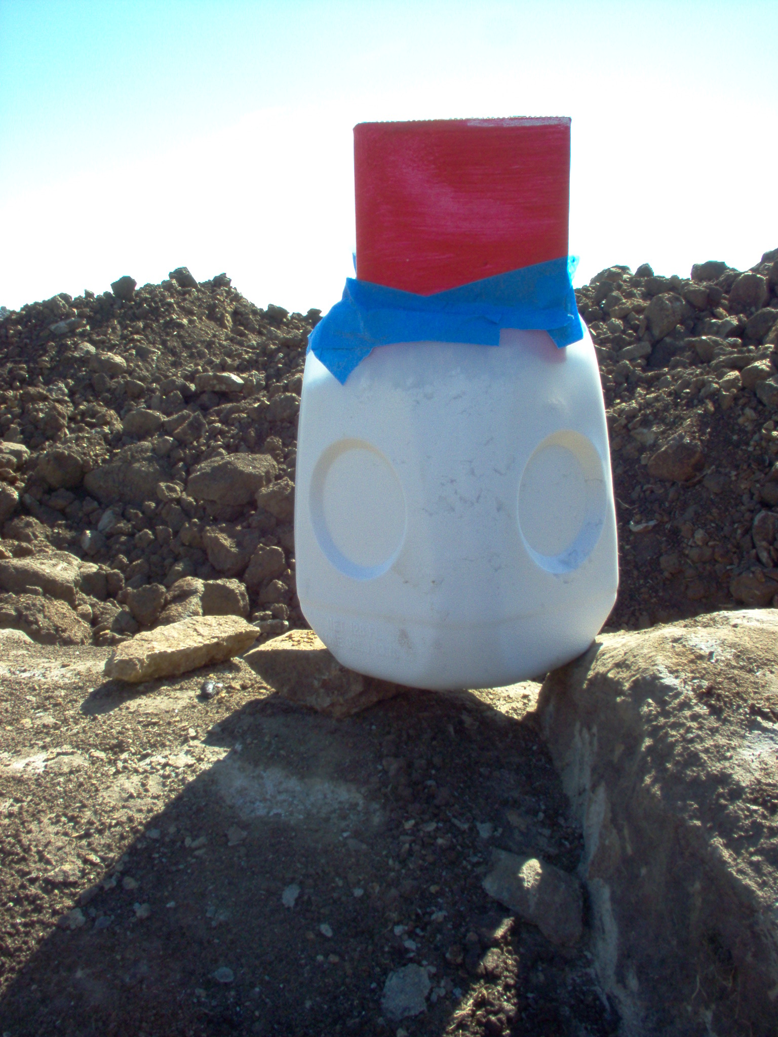 The red box on top is detonated with a rifle from 100 yards away. The milk jug has a inverted plastic cup in the bottom to form a shaped charge.