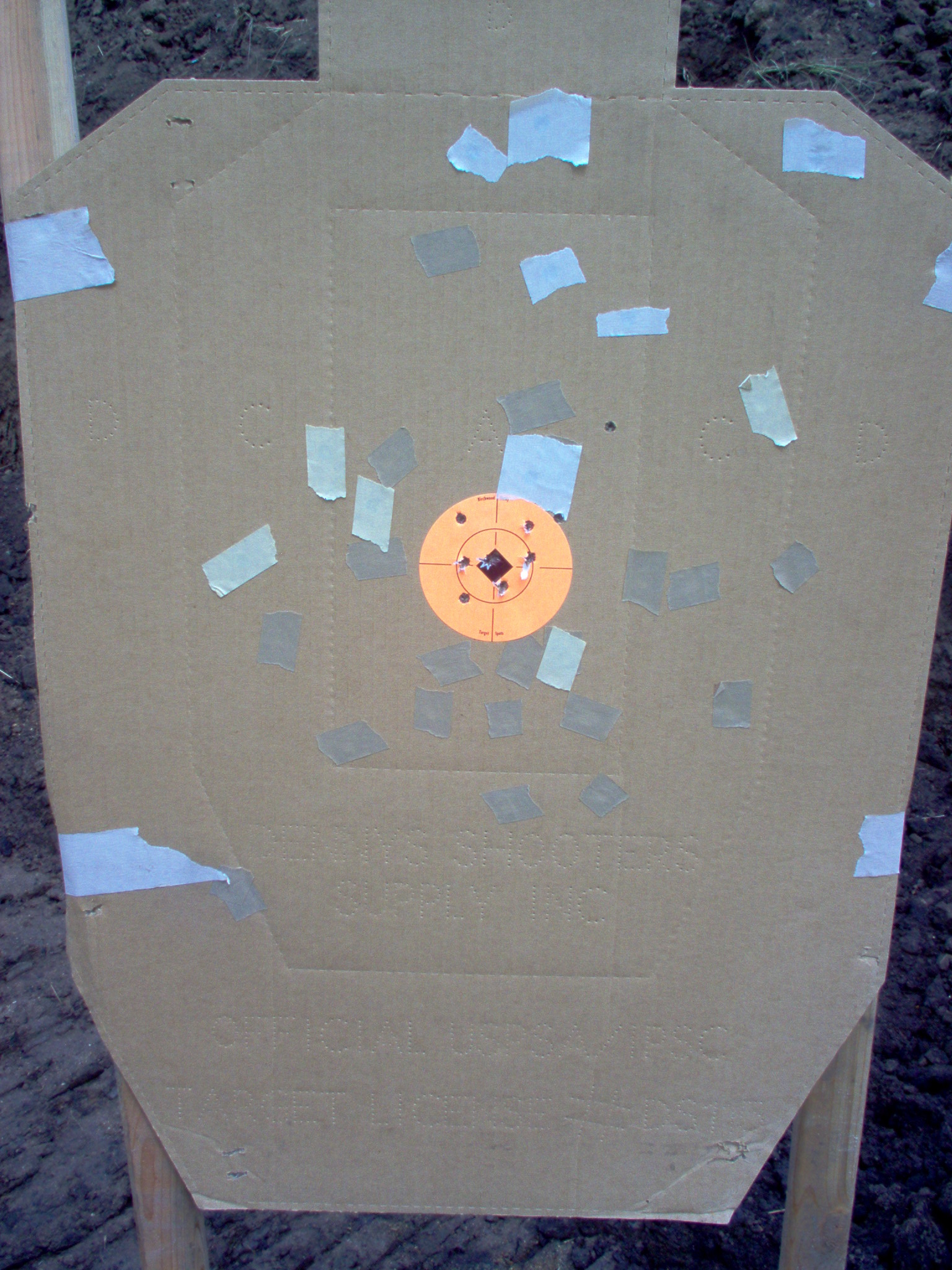The previous five shot group from 30 yard group was not taped over. Ten shots total are shown--five at 106 yards, five at 30 yards.