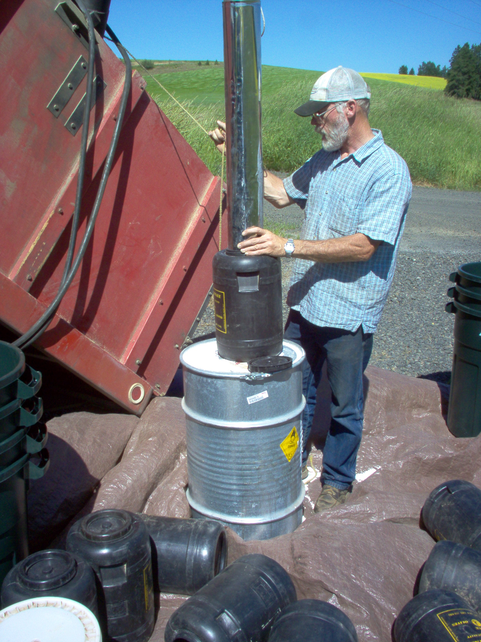July 1, 2005. A dozen new 32 gallon garbage cans, 55 gallon pickle barrels, empty potassium chlorate drums, five gallon olive barrels, and seven gallon plastic buckets. We used nearly every contaier we could find.