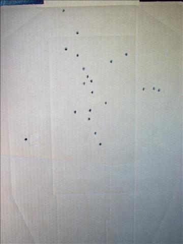 | I put up two targets at 21 feet for Kim to alternate between. From low ready to target A, then to target B. Her average time from low ready to target A was about 2.5 seconds. Between targets it was about 1.5 seconds for a total of about 4 seconds. To qualify she will have to do this in 1.65 seconds or better using a full power handgun. Her accuracy will probably have to be improved slightly also but she's doing well for her first lesson. |